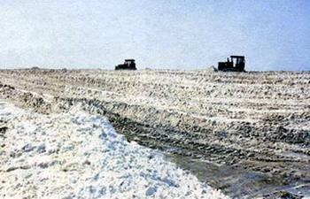 在盐桥上行驶一阵后,车子向东越过铁路来到察尔汗盐池中心地区。这里满地尽是鳞片或斑块状的盐壳及盐霜,一望无际,看不到尽头。湖区包括其西侧的东达布逊湖和东北侧的南北霍鲁逊湖在内,面积共达5868平方公里,为世界大盐湖之一。由于晚近地质时潮气候变干燥,这些内陆湖泊强烈蒸发致使湖水浓缩、高度矿化,形成的盐层厚度可达60米。其晶间卤水属氯化物型,并伴生有丰富的钾镁光卤石,为中国最大钾镁盐液体矿床。据估算,这里盐矿总储量为530亿吨,其中氯化钾有2亿多吨,居世界第二位;氯化镁19亿吨、氯化钠500多亿吨,仅后者(食盐)储量即可供全国人民食用1000多年,藏量之丰,可谓惊人!