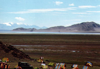 简要说明:喀喇昆仑山地区的阿尔金山国家自然保区位于新疆、青海、西藏三省区交界的新疆东南隅,地处东经80°10′~90°01′,北纬36°~37°49′之间。保护区面积为4.5万平方千米 ,是当今世界内陆面积最大的自然保护区。照片反映的是驻扎在阿牙克库勒湖边的考察队营地。
