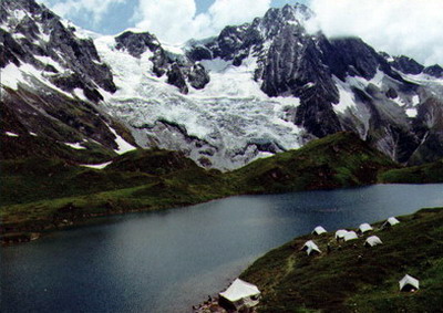 简要说明:嘎隆拉属冈日嘎布山,从波密县出发的公路通过山口进入墨脱县,山口西南侧有雪山、冰川、湖泊,这是驻扎在湖畔的科学考察队营地。
