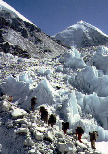 简要说明:登山队员在攀登珠穆朗玛峰过程中,经过绒布冰川消融区的冰塔林区。冰塔林是大陆性冰川消融区的一种冰面地貌,我国主要在珠穆朗玛峰北坡的冰川和喀喇昆仑山的冰川上有发育,这是中低纬度地区太阳直射对冰面产生的差别消融侵蚀,从而形成的一种似塔似林的奇特冰面地貌。