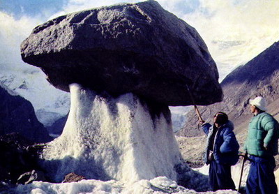简要说明:托木尔峰地区冰川下段的消融区热喀斯特现象频频出现,如冰井、冰洞、冰蘑菇、冰下河等相当发育。这是西琼台兰冰川海拔4 750米处的一个巨型冰蘑菇,冰柱支撑着的砾石约有5吨重。