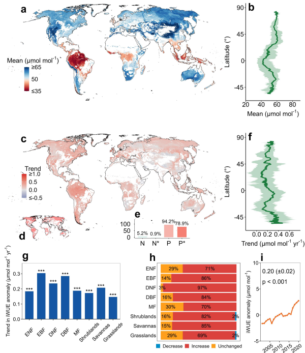 内在水分利用效率(intrinsic water use efficiency, iWUE)是表征植物叶片碳水交换的核心生理指标,直接反映光合作用中单位气孔导度的碳吸收效率。以往研究多基于原位单点观测,难以刻画不同气候带、植被类型间的空间异质性,导致全球尺度叶片水分利用效的时空动态及其对水分胁迫的响应机制仍不明确,成为陆地生态系统碳水耦合研究的重要科学空白。
