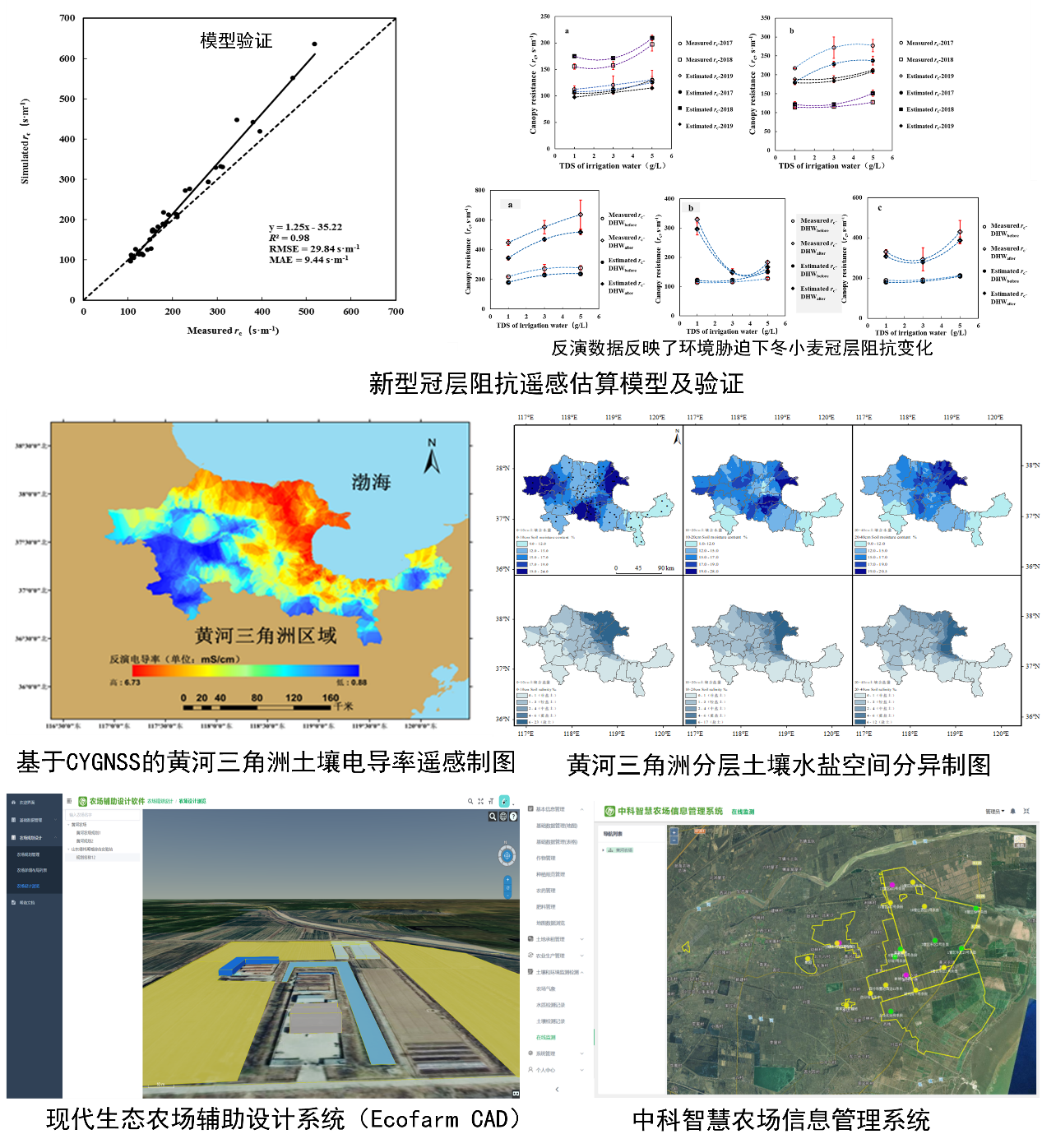 综合黄三角农田要素空天地立体监测和作物胁迫诊断研究,构建了新型冠层阻抗遥感估算模型,实现了基于遥感的作物胁迫生理诊断;基于CYGNSS数据,提出了一种精度较高的土壤盐分反演机理模型;自主研发现代生态农场辅助设计系统(Ecofarm CAD)和中科智慧农场信息管理系统,用于数字农场设计与管理。