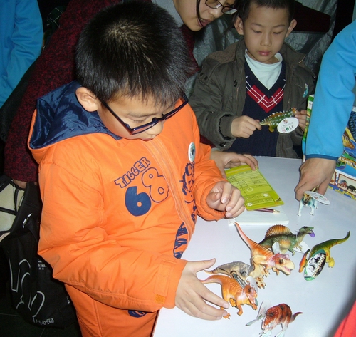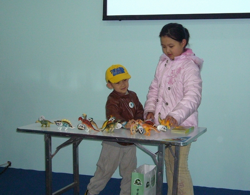 首先来个热身活动,王老师要看小朋友们对恐龙了解多少,请小朋友把恐龙进行分类。这可难不倒小朋友们,好多人对恐龙很熟悉,根据自己的标准进行分类,有的按食草、食肉来分,有的按两条腿走路还是四条腿走路来分,有的更专业,知道分为鸟臀类和蜥臀类两类。紧接着,王老师为大家展示了几块古动物的化石和模型,让大家有更直观的印象。