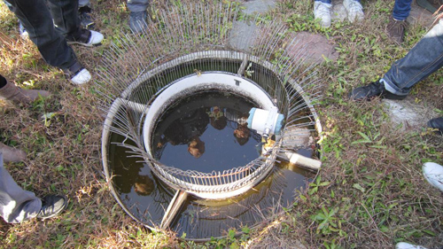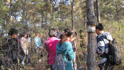 涡度相关及通量观测系统照片 离开气象场顺着坡面向上,师生们看到了树林里面的 “管子大会战”。这些特殊的管子,有的从环绕树茎的端口出发,引到数据记录仪;有的从土壤陶土头出发,连接着水银负压计;有的从地下水面出发,引到读数器。它们由研究室宋献方、于静洁、刘彩堂、李林、杨丽虎、乔云峰等人员设计,担负着观测树干茎流、土壤水分和地下水位的重任,与其他观测地表径流、壤中流、林间穿透雨等设备一起,在这儿长年累月坚守,为开展水循环与水文过程及其对土地利用、覆被变化响应研究提供和积累了第一手宝贵的原始资料。