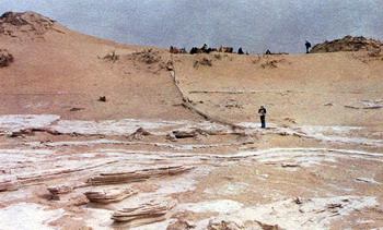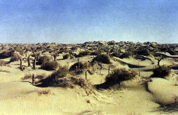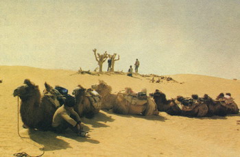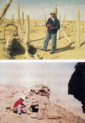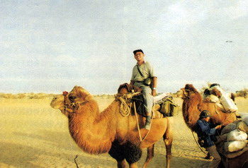 一到尼雅,中日双方学者就进行全面的踏勘,作宏观的调查。我们骑上骆驼,由自治区博物馆馆长沙比提和考古所文物保管部主任阿赫曼提做向导,在驼铃的伴随下,踏进茫茫的沙海,向沙海深入。沙比提和阿赫曼提都是维族领导干部,他们最早从20世纪50年代末就开始来尼雅,对古遗址是熟悉而有感情的。同行的还有日本京都大学学者伊东教授和他的两名助手。伊东先生的专业是木材组织结构学,这个专业在我国考古部门还是十分缺少的。显然,他到尼雅来,主要是尼雅遗址有不少用做古建筑材料的木材和反映当时环境的树木之类吧!他取样本回去实验分析研究,能确定木材的结构,树木的种类、年龄和树木所反映的当时环境等,对考古研究是会很有帮助的。我想趁此机会,也可学习学习他们的取样技术和方法。
