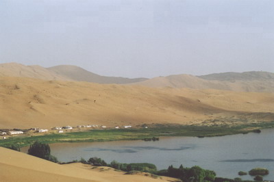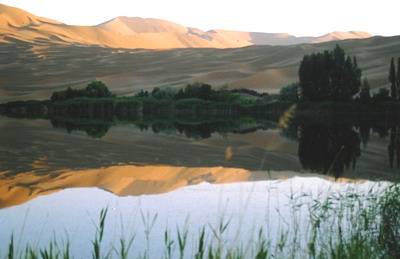 翻越了一个个高低不一的沙山,终于在太阳落山前,我们赶到了此行的终点站——诺日图湖畔中国科学探险协会巴丹吉林沙漠探险大本营,这里海拔1 270米。诺日图乃是巴丹吉林沙漠众多湖泊中最大最深的湖泊,其水域面积为147公顷,最大水深26米。宽广的湖面,微波涟漪,倒映着湖周那群被夕阳抹上金红色光彩的沙丘姿影,景色显得格外清丽秀美,而且时时还有一些水鸟飞掠湖面或在湖上游弋,更使湖域充满了勃勃生机。再看那滨岸浅水处长满了一人多高、茂密的芦苇,此外近岸沙滩上还长着较多的柳树与沙枣等乔灌林丛,一幅春意盎然、妩媚动人的秀丽画卷顿然跃入眼帘,美不胜收。这种美景,实令我惊羡万分,欣喜不已,诺日图真是个好地方,不愧为“漠北江南”!
