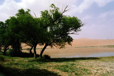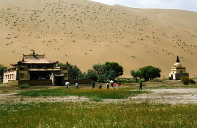 午后,我们又来到沙漠深处一个名叫苏敏吉林的海子边,那儿有一小庙,故称它为庙海子。那里海拔1 230米,湖域较大,且有着较宽坦的湖滨阶地。庙后靠岸处长着好多棵大柳树,它们枝繁叶茂,依傍着平静如镜、倒映着周边金黄色的沙丘与蓝天白云的秀丽湖泊,构成一幅巴丹吉林沙漠特有的靓丽风景,加上湖畔坐落着沙漠中唯一的喇嘛寺庙与佛塔,更为这个美丽幽静的寂落深处增添了些许宗教的神秘色彩。