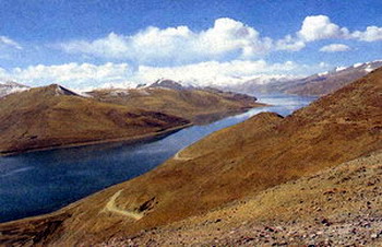 不久我们便离开江边上坡,沿着盘山公路很快来到海拨5000米的甘巴拉山口。这里虽不很高,却是雅鲁藏布江这一外流水系与包括山口南侧羊卓雍错在内的藏南高原内流水系之分水岭。站在这遍地都是由卵砾和石片垒成的玛尼堆的山口,那藏南最大的内陆湖——著名的羊卓雍错便一览无遗地呈现在我们眼前。该湖形状支离破碎,极不规则,不像常见的椭圆形模样,而像是一条大河曲折婉蜒于崇山雪岭之中。湖域时宽时窄,湖汊峡湾众多,湖中还有较多岛屿。若从空中俯瞰或如地图上所示,羊卓雍错的平面形状很像一只引颈昂首、展翅翱翔的天鹅在冲向蓝天。但我们眼下所看到的一部分湖体则像是一条大青蟒静谧安详地躺卧在山谷中,任凭过往行人尽情赏览它那碧玉般娇美的身姿。