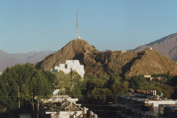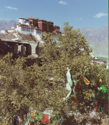 我从拉萨市北京西路边侧一条小山道拾阶而上,只见药王山体由花岗岩石构成,山岩嶙峋;曲折的小道两边山坡上则稀稀落落地生长着一些狼牙草等灌草丛。间或可见到一些居民住户杂布于其中,院前宅后还栽有若干杨树之类乔木。站在半山腰上可清楚地俯瞰到山下北京路上来来往往的行人和车辆;令人高兴的是在这里还可以不同于一般在广场上的角度来摄取兰天白云下那布达拉宫高伟壮丽的姿影,颇有另一番别样风采。再仰首看近处那高高尖峭的山顶上则建有电视塔及广播天线,不宜通往那儿,因而就此打住,没再继续往上攀登。据说,在药王山的西南侧还有一个千佛崖,那里有从公元七世纪以来不同时期的信徒们所凿刻的无数佛像,堪为壮观,很值得一看。惜时间不及,只得匆匆别过。