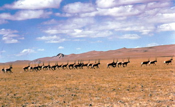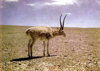 由于进羌塘以来,我的多年老战友“亲王”阿冯一直想获得一只藏羚羊做标本,现在碰到当然不会放过这么好的机会,赶忙举起猎枪瞄准它们放了几枪,可惜猎枪射程不够,连根毫毛都未碰到,倒是把它们吓跑了。一般雄性藏羚羊长1.4米左右,体重40多公斤,棕褐色体毛丰厚柔软,长短整齐,难怪它能忍受得住羌塘高原寒冷的气候。它的鼻腔很发达,鼻子两边特别鼓胀,像是两个圆圆的皮囊,有利于呼吸到更多的氧气,在空气稀薄、缺氧的高原环境里,这也是藏羚羊的一种适应性表现。另外它有强健有力的四肢,使它善于奔跑,逃避狼、狐等食肉兽类的危害。它那又长又尖的漂亮犄角乌黑发亮,角尖以下部分有竹节状突起。其形状之奇特乃其它偶蹄类动物所罕有,故有人也称它为长角羊。此羚角虽不及非洲羚羊角那样具有退烧的特效药用价值,但它在藏医学中也颇受重视,具有镇静、解热的功效;若将其烧成炭、研细,还可用于治甲状腺肿大、胃炎、久泻及催产等。当然,对它们自身来说,这对尖锐的犄角却是公羚羊用来争夺配偶时格斗的有力武器。据说,每年天暖草盛,藏羚羊发情期,就有成千头汇集在某地,靠互相争斗来择偶婚配。届时将会出现群雄纷争、残酷格斗、令人震惊的场面。