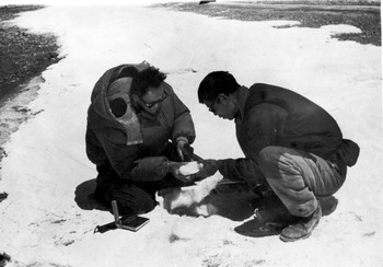 1976年6月下旬,从昂达尔错往北,一路所经过的湖泊多为既无鱼类生存,又不见鸟禽飞翔的毫无生气的盐湖,像湖滨滩地上铺满了白色盐霜的蒂让碧错、积有厚达10~20厘米透明晶体状芒硝层的才多茶卡等,而一些所谓的河流也大多干涸无水,可供饮用的泉眼也渐稀少,淡水匮乏的形势严重威胁着我们的健康和生命。所携带的地形图上除了标出的不能饮用的盐湖及一年内大部分时间断流、仅在雨后才有少量水流的季节性河道外,并无适口甘泉的标记。所幸有了解途中水源状况的江措向导带路,我们每天基本上都能找到一个泉水出露点,并以此作为我们每天行程的归宿处。因此,每天考察路程的远近自然也就取决于相邻两个泉眼之间的距离了,一般在20~30公里。然而糟糕的是有些泉水常含有较多硫酸盐或氯化物等盐类,味道苦涩,矿化度超过国家规定的饮用水标准。尽管这样,也只得将就着勉强喝下, 除了喝苦泉外,也有整天找不到一滴水的情况。如有一天太阳快落山时,还未寻到泉眼,大家累了一天,又渴又饿,实在没办法,只得在干涸的河床内,找个低洼处掏沙挖坑,看看能不能找到些地下水。费好大劲挖到一米多深才见到从泥沙层中渗出些混浊的泥水来,我们就汲取来烧了一锅黄泥汤,每人分上一碗冲了奶粉和白糖,顾不上什么卫生就津津有味地喝了起来,有人还诙谐地调侃:“这羌塘牌的可可奶味道好极了,啥时候再来喝它一回!”