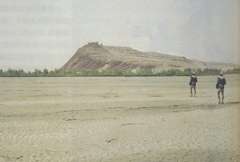 第二天一早,我们就越过和田河爬上麻扎塔格山进行考察。麻扎塔格山维吾尔语意为“坟山”。因红山嘴上有一伊斯兰殉教者的坟墓而得名。据传说,有一名叫玛江汗的妇女,为伊斯兰教军暗送军情,被和田佛教军处死。伊斯兰教军战胜佛教军后,葬她于红山之巍,后来的伊斯兰教信徒视此处为圣迹,常来此凭吊、膜拜。