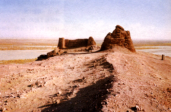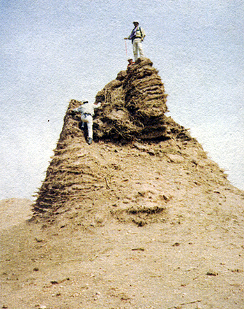 就在耸立的红山嘴之颠,矗立着一座残破的古戍堡和一座烽隧(烽火台),这是唐代以前古“丝绸之路”上的军事要塞遗址。由于塔克拉玛干沙漠干燥少雨,城堡和烽燧虽历经1000多年的沧桑,至今仍然屹立在山头,而且保存比较完整。城门、瞭望台、城墙历历在目。该城堡城墙最高16米,墙厚1.5米以上,城堡面积约1 100平方米,靠城堡西不远为耸立的烽火台,台高约7.5米。这些古建筑均系就地取材,用棕红色泥巴夹胡杨枝垒砌而成,城堡下部有地道与仓库连通。在古城堡的废墟中,我们捡到了唐代的铜币、箭头及盔甲上的铜夹片等,还发现了木简和陶罐及其中碳化了的麦粒,这些将为我们确定城堡的年代和废弃原因提供重要依掘。可以肯定,在这里还会发现不少的文物,它们的存在是千余年来“丝绸之路”兴衰的见证。据史书资料,隋唐时,和田河已改道北流,其流域水草丰足,是一条由丝路北道直达于阗(今和田)的捷径。在唐朝与吐蕃争夺于阗的战乱年代里,麻扎塔格山必然成为一处扼守于阗北境的战略要地,至今巍然屹立在红山嘴之巍的古堡和烽燧就是这段历史的见证。当年战马嘶鸣、兵戈铿锵之声,仿佛回荡在古堡上空。