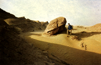 我们来到离和田河20公里的地方,这里麻扎塔格山被隔断为东西两列。东侧山地作北西西走向,西侧山地作北东东走向,中间是宽缓低下的山口。东侧山头上出露的是灰白色的石膏地层,刃状的山脊受风化剥蚀呈锯齿状起伏。山的主体出露的是下第三纪棕色砂岩夹泥岩地层,它们一致作南西方向倾斜。在风和水的长期侵蚀剥蚀下,红层坡面形成一系列平行的冲沟和切沟,就如新疆吐鲁番有名的火焰山坡面侵蚀形态一样,颇为醒目。而顺层又形成一系列单斜谷地。由于断层、裂隙的纵横分割,这里在差异侵蚀剥蚀下又形成各种奇形怪状的造型地貌,如城堡,如立柱,如蛤膜卧伏,如蘑菇打伞,千姿百态,大自然的鬼斧神工,令人叹为观止。