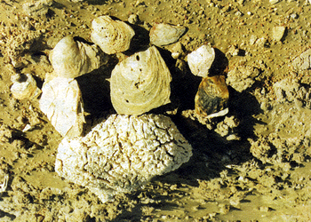 我们迎着山口前行,一路看到不少风化的蚌壳、螺壳化石,使我们大开眼界。山口两侧的红山崖边,竟是盛产化石的地层,我们挑个大、完整的捡,捡了不少。像这样盛产化石的地层,在自然界也是很难遇到的。这是在下第三纪地层内的海相古生物化石。它们有腹足类、软体类、介形类等多种,它表明2000万年(下第三纪)前的塔里木中部还是浩瀚的大海,现在海洋变成了沙漠中的山地。自然界沧海桑田的变化在这里体现多么明显!