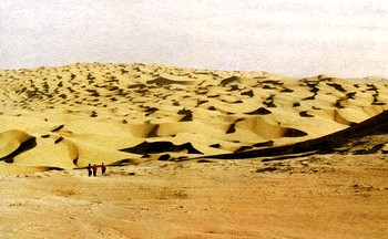 我们登上山口向北侧瞭望,景色的突变使我目瞪口呆。眼前竟是一片沙丘层叠起伏的沙海,这是由一系列新月形沙丘链复合组成的沙山。黄澄澄的沙丘链状延伸,排列叠置,似凝固着的瀚海金浪。我们又一次看到了塔克拉玛干沙漠腹地流动沙丘的雄姿。单个的新月形沙丘一般高三十多米。它们叠覆在一起,构成连片起伏的沙山,高的可达一百多米。在众多新月形沙丘的簇拥下,远处出现一座耸峙的沙山,它三面有棱,棱角分明,恰似金字塔般,这就是金字塔沙山了,是一种沙漠中罕见的类型。由于太阳的斜照,沙丘的凹部有着一列阴影,使整个沙丘变得立体感十分强烈。年轻的考察队员穿着红色的信号服向沙海奔去,我们架起摄像机,每个人都端起照相机,拍摄下这瀚海腹地的壮景。我越过山口沿山向东奔跑,目标就是远处山麓那座最雄伟的金字塔沙山。我深一脚浅一脚地在沙海中勉力奔跑,满身是尘沙,汗水挂在积满尘垢的脸上,口干舌燥,喉头似要冒烟,鞋里袜里灌满了沙子,我赶紧脱下鞋袜挂在肩上急行,我要赶着阳光好的时刻到达沙山跟前。急行两公里,我终于来到那山麓,以激动的心情拍摄下一座壮观高大典型的金字塔沙山。而我们风沙地貌组的同志也紧跟在后面,他们在此架起了经纬仪、平板仪,详细地侧量着这罕见的沙丘,并要观测它的动态变化和研究它的形成机制。这次测量得金字塔沙丘耸立的塔身高度为58米,若加上它下面簇拥的沙丘,总高度在80~100米之间。分析这高大金字塔沙丘,它位于北西西向麻扎塔格山的北麓,其西侧有一低下山口切过山地,为南北向气流的通道。这样,塔克拉玛干沙漠腹地盛行的北东和北西向风的吹扬,势必受麻扎塔格山山地的阻挡而折射,形成多种不同方向的地形风,再加上流通的山口风的作用,甚至还有因山地存在而造成近地面的逆温层的作用(其对启动风沙风的影响作用)等等,多种风向在近地面复合,有众多沙子物源而就地起沙,才综合形成了这种特殊类型的沙丘地貌。麻扎塔格山北侧的沙丘可以作为塔克拉玛干沙漠腹地的典型,这里流动沙丘类型之多,沙丘组构、成因和动态变化之复杂,沙丘之高大等都是少见的。