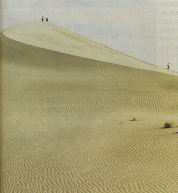 我们东西向横穿大沙漠,最终目的地是西部和田河畔的麻扎塔格山。因此,我们在酷热难熬最困难的时候,都惦念着麻扎塔格山,似乎把它看作是一种希望的象征,是一种坚持前进的精神支柱。因为,见到了麻扎塔格山,就是到达了和田河畔,到达和田河畔,就有了水,就标志着我们胜利了,有了生命,我们从“死亡之海”走出来了。但是梦寐以求的麻扎塔格山不是那么容易到来的。日复一日,翻过一座座沙丘,眼看前面又是高耸的山影,啊! 是否就是麻扎塔格山啊! 努力爬过去,脚下仍然是一条沙岭,周围仍然是一片沙海的波涛,而前方远处仍然是一列列起伏的沙岭,我们就这样带着对麻扎塔格山的无限向往,不停地前进着。一直走到第六天的上午,当我们翻越一座高沙岭时,我们终于隐约看到前方一座山岭,它竟是下白上红的两列山岭。我们欢呼雀跃起来,计算距离,这极目所见的条状山岭,大概要在20公里以外吧! 高兴之余,我们竟又怀疑起自己的眼睛来了,这是否是沙漠里海市蜃楼的幻影呢! 但这次是确凿无疑了。我们高兴地喝光了随身带的最后一桶饮料,摊开地图,调整好方向,朝着红白山头,奋勇前进。翻过脚下的高沙岭,眼前景观大变,沙丘变小了,变疏了,点点丛丛的绿色的植物出现了,显然,我们越过了最困难的中央流动沙丘带,进入了和田河东侧的古河道作用区了。在那低沙丘的洼地中,我们首先遇到的是一丛丛的鹿角草,它是那样绿嫩,那样的可爱,给我们这些沙漠苦行者带来了生机和活力。