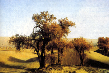 植物学家告诉我们,胡杨还是世界上最古老的杨树品种。在我国库车千佛洞和敦煌铁匠沟的第三纪渐新世地层中,曾发现过它们的化石,距今已约有6500万年。如今,世界上胡杨已很少见,除中亚、北非一带的沙漠和干旱荒漠中尚有少量生长外,我国新疆是胡杨分布最广、面积最大、资源最多的地方。特别是塔里木河、叶尔羌河、和田河、克里雅河两岸,胡杨林构成几百公里长的天然绿色走廊,为世界其它沙漠所罕见。这些原始胡杨林的存在,对阻挡流沙移动、改变恶劣气候、维护生态平衡,有很大的作用。