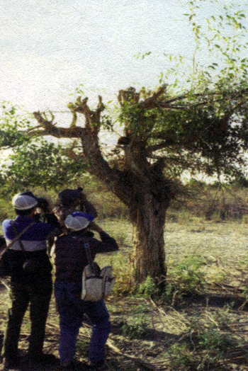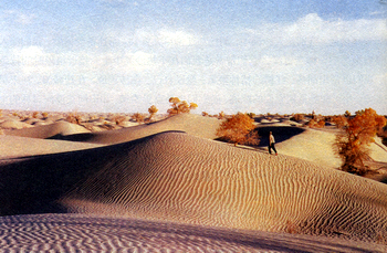 天然胡杨林的保护是一个亟侍解决的问题。目前,主要由于不合理的人为开发。无论是在和田河还是在克里雅河,天然胡杨林面积已有缩小趋势。可以毫不夸张地说,在克里雅河下游的考察中,我们只在琼麻扎地方才真正看到两棵原生的完整胡杨树。而其它的胡杨几乎都被剃过光头(砍下树冠的嫩枝叶做饲料),这就是通常所说的“头木”作业。胡杨的嫩枝绿叶是最好的精饲料,因此它们几乎无一幸免都要被 “砍头”。而琼麻扎这两棵原始胡杨的幸存,我想主要还是托庇于它长在琼麻扎(大坟地)之前,托庇于长眠于此的大阿訇的亡灵和宗教的保佑吧!