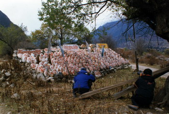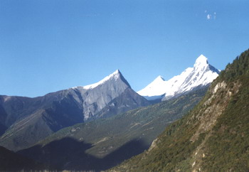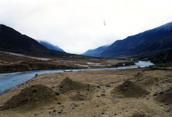 在波得藏布汇入帕隆藏布处的东侧山地,站在卡达桥上就能看得很清楚,山地有完整典型的古冰川U形悬谷和尖峭的雪山(实为冰川作用留下的刃脊地形),十分醒目,它预示着马上进入波得藏布后,一定会有冰川地貌。从卡达桥往上经倾多区、许木区到育仁区大概70千米的河段,皆为宽敞的U形谷地,谷底平原农业发达,坐落着一系列藏族的村落,村旁路边,多有玛尼堆、经幡等宗教标志。村中则都有喇嘛庙。我们看到两处大型的玛尼堆,多种色彩的经幡随风飘拂,组成玛尼堆的皆为花岗岩质的冰水砾石,上面刻有红色经文,这是在西藏其它地方所没有见到的。河谷平原上有大型的机械化农场,还有大型的劳改农场。这里盛产苹果和蔬菜,我们经过那里时,农场给了我们两麻袋大白菜和土豆,一棵大白菜足有5公斤,看来这里自然条件是很好的。在缺少蔬菜的西藏地区,大白菜和土豆,是最好的礼品了。