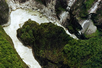 雅鲁藏布江下游,突然围绕南迦巴瓦峰作一个奇特的发卡形急剧转折,这在世界大河发育史上是很罕见的现象,不能不引起科学工作者的注意。而且上千立方米流量的江水,涌集在不足百米宽的峡谷中,白浪滔滔,左右冲撞,急流直下,算得出吗?这里蕴藏着多么丰富的水力资源,足令世界震惊!大峡弯是那样的幽深神秘,至今还没有一个人能沿江走完大峡弯,这里的一切还是谜一样的空白。我曾从大峡弯上口米林县的派区沿江向大峡弯深入,一路用绳索攀过多处临江的陡崖,多处砍树架桥,通过支沟急流,穿行于原始丛林中,用砍刀砍出前进的道路,才到达叫白马狗熊的地方。这里江边是直上直下的刀切般的绝壁,再也无法通行了,我们不得不返回。后来又通过多雄拉山口进入墨脱,再溯江而上直到大峡弯顶端的岗郎、扎曲,逆帕隆藏布到川藏公路。据乘直升飞机飞越大峡弯的人说,峡弯江流百十公里急湍直泻,就像一条奔腾的瀑布一样,险恶之极!壮观之极!