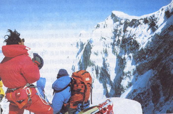 我们在南迦巴瓦峰西坡海拔3 520米的接地当嘎建立了大本营,天气晴朗时能见度极好,从这里仰望南迦巴瓦峰,似乎可以摸得到它。南迦巴瓦峰的主峰呈三角形,高耸险峻,直插云霄,它近于南北走向的两翼,峰峦起伏绵延十多千米。山脊上的冰雪闪烁着冷青的亮光,好似飞舞的银蛇。其中西北翼山脊有好几座7 000米以上的高峰峥嵘突兀,最后没入雅鲁藏布江大拐弯;西南翼中间隔着凹下去的南坳与7 043米的乃彭峰平台相连。乃彭峰平台长7~8千米,是个向南西倾斜的平台,平台上覆盖着上百米厚的冰雪,是以前几次攀登南迦巴瓦峰必达的依托之地。平台西南几经起伏,中间有海拔4 000~5 500米之间的那木拉、多雄拉、德阳拉等山口,构成贯通喜马拉雅山南北人类活动的主要通道。南迦巴瓦峰的西坡,山体是一系列刀切似的峭壁陡崖,几条冰川宛如瀑布飞泻而下,雪崩冰崩的滑道似刀刻一般清晰可见,在阳光下反射出道道寒光,令人触目惊心。