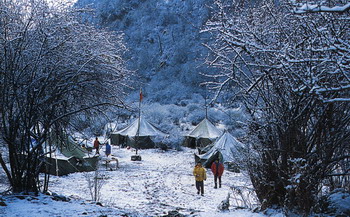 3月l2日晚,下起了大雪,漫天迷蒙。在那万籁俱寂的雪夜,只听到雪粒落到帐篷上的刷刷声和积雪间或从帐篷上塌滑的声音。我们在海拔4 400米营地的帐篷很快被雪埋起来了。在这大雪之夜,四周山头雪崩之轰鸣声此起彼伏,使人感到危机四伏、惊心动魄,难以成眠。降雪整整持续了三天三夜,我们则卧冰赏雪,目睹雪崩奇观,体会着“四面楚歌”的滋味。这又是一种雪崩,叫重力型雪崩,它是山地冰川发育的一种主要补给方式,维持着冰川的生命。