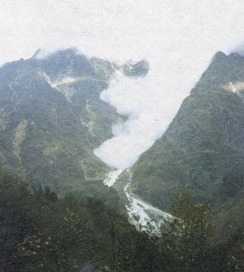 1983年春天,我随中国登山队第一次来到南迦巴瓦峰。3月9日是一个大好的晴天,考察队员和登山队员穿过海拔3 600~4 200米的林海雪原向主峰挺进。“路”上灌丛密集,积雪埋没双膝,既要踏雪又要砍灌丛才能前进;雪灌进鞋袜化成水又结成冰,身上冒起阵阵热汗,真是冷热夹攻,这一切给我们的行动造成很大困难。到海拔4 200米以上,算是走出了森林带,向阳的山坡出现高山草甸灌丛,积雪斑斑点点;对面阴坡盖着厚厚的积雪,阳光下白晃晃的真刺眼。中午灼烈的阳光下羽绒服已经穿不往了。下午5点,雪崩了,不只一处!但见周围山头雪尘滚滚而下,山谷中充满了隆隆的轰响,那具有立体感的回响使人恐惧。略带土黄色的崩雪犹如决堤的洪水漫溢大地一样,沿沟谷滑道直落谷底森林之中,沿途水桶般粗的树木都被齐刷刷地折断,随即谷底又隆起一个矗立的雪崩锥体。往往雪崩之后还有大量崩雪从陡崖跌落,形成雪的飞瀑,极为壮观。通常较大的雪崩还能触发周围山坡一系列的小雪崩,此起彼伏,景色之惊险壮观,也是难得目睹的奇观。被强烈的阳光照射而引起的雪崩一般是融水性雪崩。阳光晒化积雪使融水下渗,融水就像润滑剂一样导致了积雪的不稳定而发生崩落。这类雪崩多属大中型,破坏性很强,对登山活动危害最大。