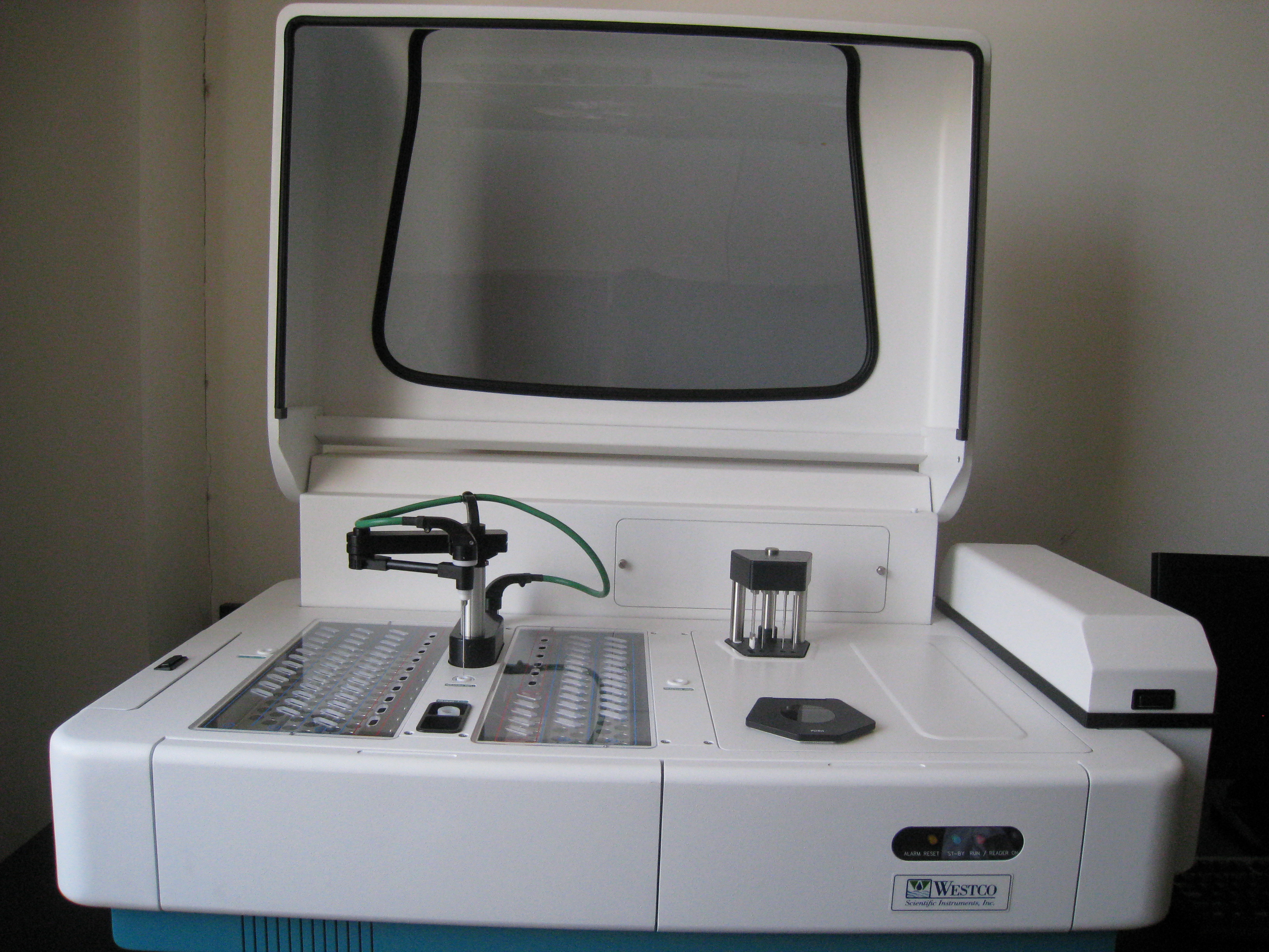 仪器名称:全自动化学分析仪 仪器型号:SmartChem200 仪器简介:Smartchem全自动化学分析仪又叫离散式化学分析仪或间断式化学分析仪。使用经典的比色法。利用机器人技术,全自动取样针把试剂和样品精确地加入比色杯中,搅拌混匀,反应。然后利用高精度双光束数字检测器测量吸光度。对于不同的测量参数,Smartchem可以自动选择相应的波长并测量,不需要更换模块,常规测量客户只需要编排测试顺序,装载试剂和样品,然后机器进入自动测量模式。 应用领域:土壤浸体液、水体等液态样品硫酸根、氯离子、磷酸根、硝酸根、铵根等自动分析测定。 |