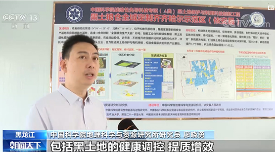 9月23日,中央电视台新闻频道“朝闻天下”栏目以“丰收节里看丰收:保护黑土地 提升粮食产能”为主题,报道了黑土粮仓全域定制齐齐哈尔示范区建设成效。新闻介绍了齐齐哈尔市依安县与中科院合作建设黑土地保护示范基地,进行黑土地保护增产技术示范推广成效。示范区负责人中科院地理科学与资源研究所廖晓勇研究员接受央视采访,讲述了实施分区施策,一地一策的精准化策略,依托大数据和星空地网监测,用好、养好、管好黑土地的全域定制模式。