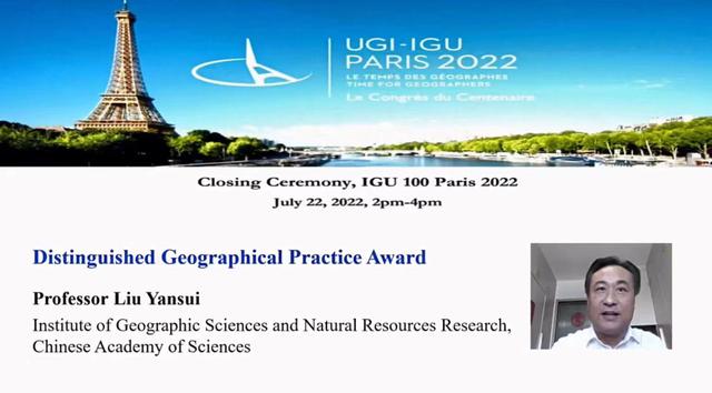 巴黎时间2022年7月22日下午,国际地理联合会(IGU)百年庆典特别大会举行了2022年 IGU奖项颁奖仪式,中国科学院地理科学与资源研究所刘彦随荣获国际地理联合会杰出地理实践奖。IGU的授奖理由:“在土地利用、乡村减贫与乡村振兴的科学决策和实践,以及农业地理工程应用领域作出了杰出贡献。”颁奖后,刘彦随代表中国获奖者发表了热情洋溢的获奖感言。