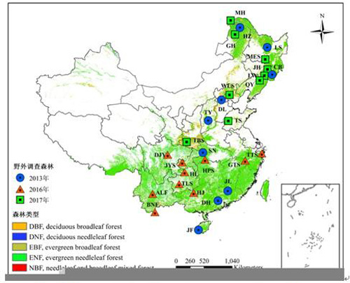 图1:研究团队已调查的中国东部32个典型森林生态系统 |