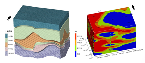 Fig.1 soil textures of the study area (左图) and spatial distribution of the comprehensive assessments performed by the BP networks at different pollution levels (右图). |
