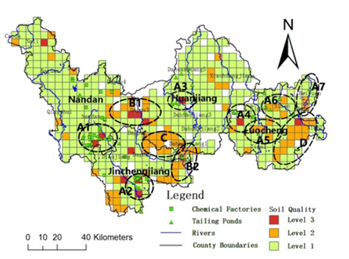 Fig.2 Spatial distribution of soil environment quality, and 4 categories of high risk areas |