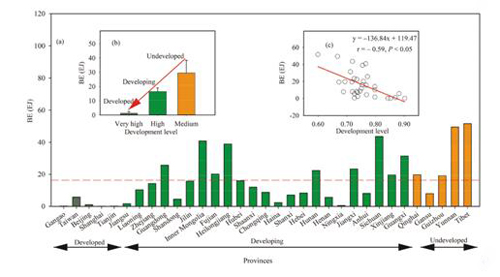 中国陆地生态系统植被的生物质能储量为535.91 EJ,相当于18.29GT标准煤或三峡大坝1520多年的发电量总和(图1和图2)。1980-2060年,中国植被的生物质能储量一直呈增加的趋势,但如果按现在植被类型不改变情景下,将在2030年增速达到峰值。同时,研究人员也发现中国生物质能的储量与区域发展程度呈现显著负相关(图3)。研究结果说明中国具有丰富的生物质能储量,政府应该大力支持生物质能产业的发展,尤其是在目前煤和生物质能共气化技术迅猛发展的背景下,生物质能的高效利用技术应该被大力发展。同时,政府应该注意其区域发展的可持续性,落后地区的部分生物质能利用可通过经济补偿转移至发达地区以满足其能源需求,实现双赢。