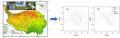 全球环境变化正在改变着陆地生态系统。过去的研究多关注生态系统层面的响应,而植物群落对全球环境变化的反应了解较少。通过在藏北高原高寒草甸进行多年的模拟CO2浓度升高 (+100 ppm) 和N添加野外控制实验,研究人员发现CO2和N添加对高寒草甸物种多样性、群落结构和生物量具有协同作用。单独添加CO2和N没有改变群落生物量、物种多样性和物种组成;而同时添加两种资源显著提高了群落生物量,降低了多样性,改变了群落物种组成。物种多样性的下降,主要归因于CO2 + N 增加了生物量,降低了土壤水分,促使一些个体大和比叶面积小的物种丢失。研究指出高寒草地群落生物量和群落结构可能受到大气CO2和土壤N营养的共同限制。