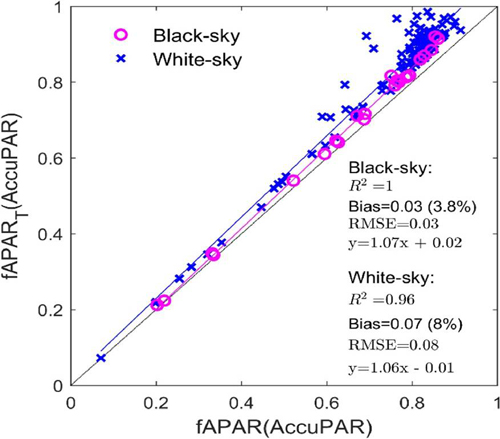图1. AccuPAR获得的四通量fAPAR与二通量fAPART的对比