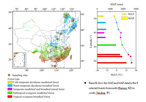 中国南北森林样带(NSTEC)是国际地圈-生物圈计划(IGBP)认定的第15条标准样带,从北到南年均温为-4.4~20.90 oC,年降雨量为481.60~2449 mm,样带覆盖了北半球从热带雨林至寒温带针叶林的绝大多数森林类型;该样带是一条明显由热量驱动的标准样带,是探究生态系统性状与功能及其对环境变化响应的“天然实验室”。