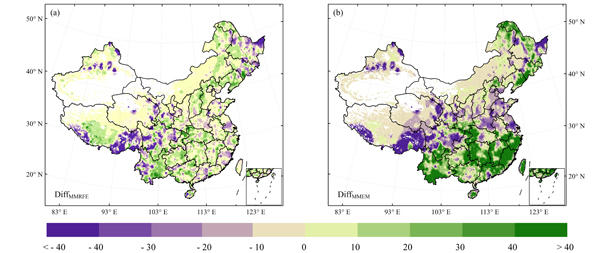 图1 (a)多模型平均植被碳密度与观测的植被碳密度之差;(b)本研究的模型与观测的植被碳密度之差(Mg C ha-1)