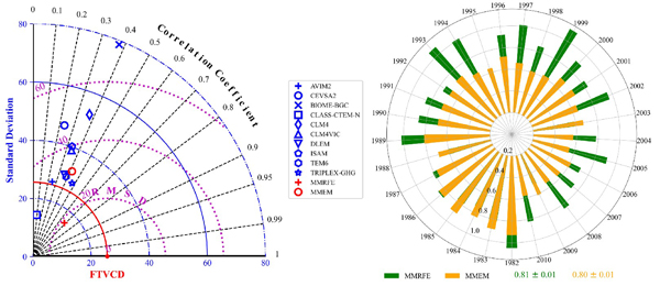中国科学院地理科学与资源研究所黄玫副研究员、王昭生博士等基于AVIM2、CEVSA2、BIOME-BGC、CLASS-CTEM-N、CLM4、CLM4VIC、DLEM、ISAM、TEMP6和TRIPLEX-GHG模型模拟的1982-2010年中国植被碳密度数据,结合野外调查的植被碳密度数据,利用机器学习随机森林方法构建了新的中国陆地植被碳密度的估算模型,重新估算了1982-2010中国陆地植被碳密度。与观测数据相比,随机森林多模型集成模拟结果仅低估了约0.2% (图1)。而传统的多模型平均的结果高估了约2%的中国区域植被碳密度。同时,泰勒模型比较结果表明,基于机器学习的模型模拟结果具有最小的标准差,最大的相关系数(图2a)。此外,随机森林多模型集成模拟结果与NDVI的年变化趋势较为一致,而多模型平均结果与NDVI的年变化趋势相反(图2b)。总之,随机森林多模型集成模型可以有效提高估算国家尺度陆地植被碳密度的精度,有助于减少大尺度植被碳储量估算的不确定性。本研究为集成多模型模拟结果减少碳估算不确定性提供了新的估算方法。