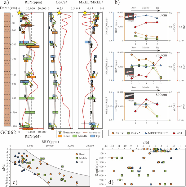 针对以上关键科学问题,郭庆军研究团队创新性的系统分析了稀土赋存的三大载体:海水、孔隙水和磷灰石的稀土元素特征,率先发现两大孔隙水稀土元素富集事件,发现深海盆地沉积物中通过孔隙水向海水输入的稀土的量比浅海明显偏少,大量的稀土元素留存于沉积物中,最终被磷灰石所吸附。本研究从机理上揭示了稀土元素迁移和富集的全过程,创新性的从稀土循环的角度解决了深海稀土富集机制问题,为后续的勘探和开发提供了重要理论依据。