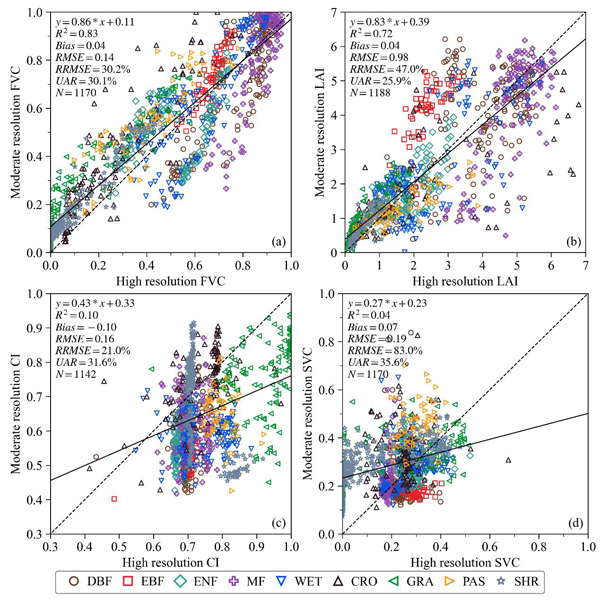 (图1. 中分辨率FVC、LAI、CI和SVC产品与高分辨率参考数据对比)