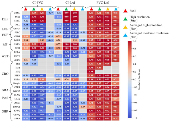 (2)当前的验证研究大多是针对单参数的验证,通常不考虑参数间的关系,本研究提供了一种新的产品评价范式即不同参数的关系评价。研究发现FVC与LAI在不同空间尺度上呈强烈正相关,尤其对于森林类型。相比于森林,CI-FVC/LAI关系对于草地及灌木表现出更好的空间尺度一致性。CI-FVC/LAI经验关系在不同空间尺度有不同表现,应谨慎使用。