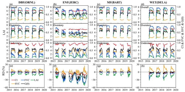 (4)研究揭示了植被结构参数及其关系的垂直分布特征。对于大多森林类型而言,总体CI和G(0)与林上植被层十分接近,森林总体的CI-FVC/LAI关系主要由林上植被层制约,而FVC-LAI的关系则由林上和林下植被层共同影响。SVC的类型、季节和垂直特征表明单位LAI的概念可拓展至FAPAR、GPP、蒸散发和降水截获等方面用于表征叶片效率。