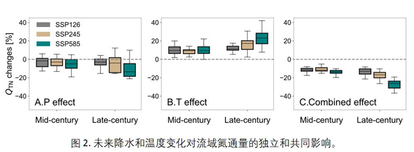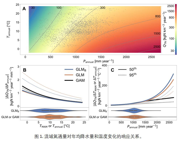 先前的研究主要关注降水变化对河流氮的影响,发现降水增多会显著增加河流氮通量。然而,升温会增加土壤和底泥中微生物活性,从而增强反硝化和厌氧氨氧化速率,导致硝态亚硝态氮转化为N2和N2O(强效温室气体)释放到大气中,进而减少河流氮通量。目前,温度对河流氮的影响还未量化,特别是对变化环境下降水和温度对河流氮的共同影响仍缺乏认识。