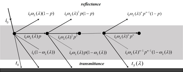(1)从理论起源看,光谱不变理论的相关概念源于概率辐射传输模型,采用的建模思路实际上是对光子多次散射的一种简化计算策略。光谱不变理论最先用到了三维冠层辐射传输建模中,后来又被推广到叶片、叶簇和林冠等不同尺度的冠层反射率建模。