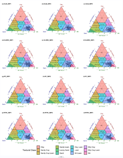 图1.不同方法的预测值在USDA土壤质地三角图上的分布