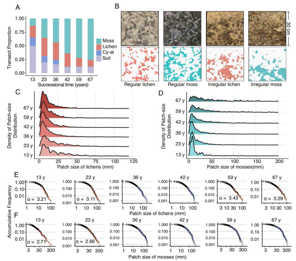 研究团队采用了计算建模与全局-局部耦合的野外调查相结合的研究方法。理论建模基于概率的元胞自动机(Cellular automaton)模型的开发,模拟了地衣和藓类斑块的动态变化。野外观测在中国科学院沙坡头沙漠试验研究站进行,通过在不同演替阶段的人工固沙植被带中设置样线,记录了生物结皮的覆盖度、组成和斑块大小分布。研究通过对幂律分布的拟合,从全局尺度检测主导生物结皮动态的反馈模式。通过不同演替阶段和不同斑块大小下,生物结皮斑块中心与边缘之间的生长差异的比较,从斑块尺度验证局部自组织过程。对比模拟结果最终揭示生物结皮自组织机理及其生态意义。