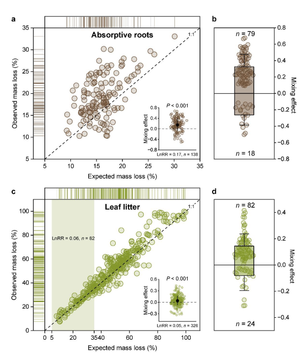 植物与分解者多样性对凋落物分解过程具有重要调控作用,并可在一定程度上缓解气候变化对分解系统的负面影响。长期以来,相关理论与经验研究多聚焦地上叶片凋落物,发现不同植物叶片混合分解常出现“非加性效应”,即实际分解速率偏离基于单种的预测值。然而,地下系统中多样性–分解关系的总体规律仍缺乏系统性认识。相比叶片,吸收根“周转快、分解慢”,是维系森林土壤碳库的重要来源;在多样性情景下,其大尺度分解模式的实证研究仍属空白,限制了我们对植物多样性在生物地球化学循环中作用的全面认知。